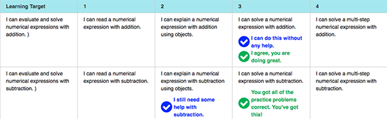 Teachers can provide rich feedback based upon both the student work and their self-assessment. This includes both free text and choosing a level on the rubric to help students understand their current progress. Increased specificity of feedback helps students make corrections and speed learning.